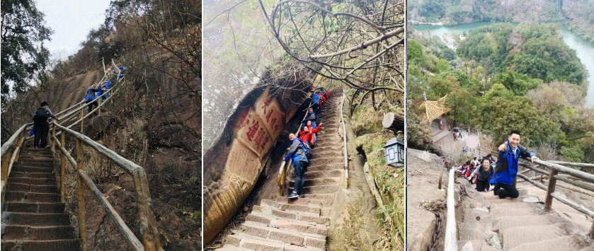 長老峰景區最高處海拔409米,它與眾多名山相比遠不算高,也不算大,但它集黃山之奇、華山之險、桂林之秀一身,具有一險、二奇、三美的特點。石階雖陡,美迪斯人團結互助,互相鼓勵,咬釘嚼鐵,知難而進,勇攀高峰!