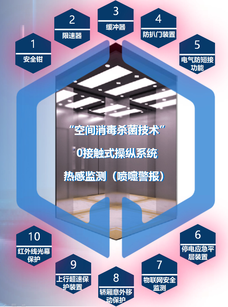 最近,美迪斯針對(duì)此次疫情傳播特點(diǎn)、結(jié)合傳統(tǒng)電梯安全技術(shù),大膽跨界引入高尖端技術(shù)進(jìn)行創(chuàng)新,迅速研發(fā)出“新型安全電梯”。該產(chǎn)品可以高效殺滅病毒和細(xì)菌,隔斷傳播路徑,保障用戶的使用安全。該系列產(chǎn)品具有下亮點(diǎn):