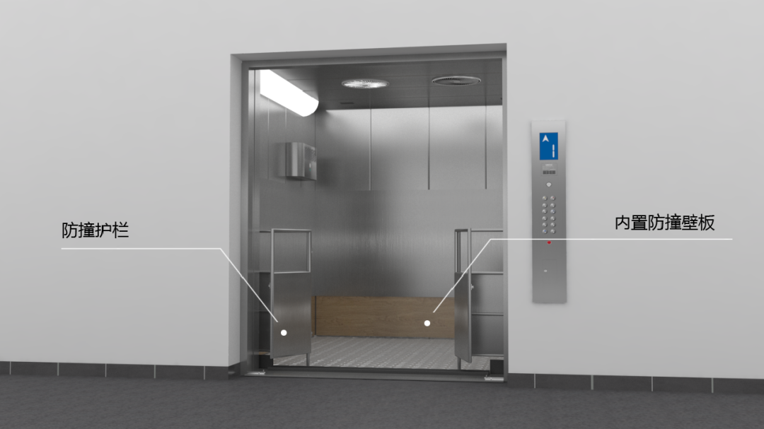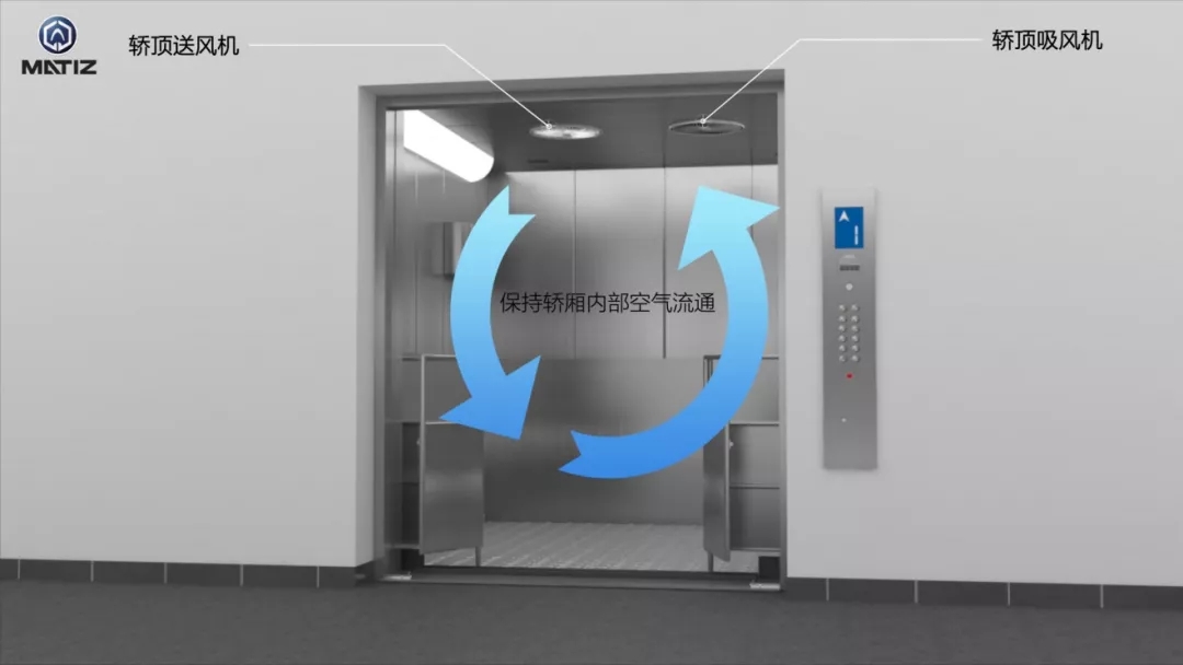 在頂部配置強力通風設(shè)備以及冷氣空調(diào),保證轎廂內(nèi)空氣迅速流通。