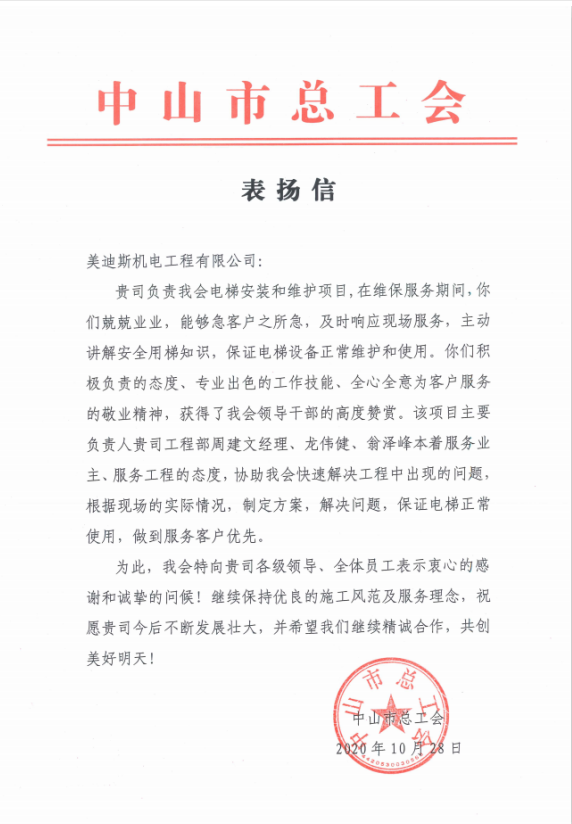電梯的安全運行,離不開電梯維保人員日常的努力。近日,美迪斯工程服務部收到了中山市總工會發來的表揚信:“在維保服務期間,兢兢業業,能夠急客戶所急,及時響應現場服務,積極負責的態度、專業出色的工作技能、全心全意為客戶服務的敬業精神,獲得了我會(中山市總工會)領導干部的高度贊賞?!?/span>