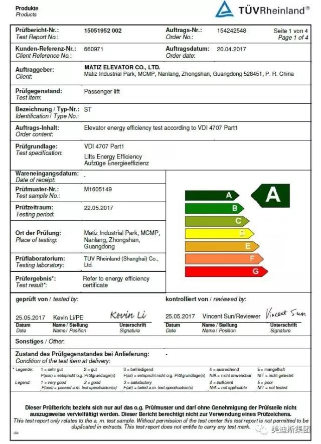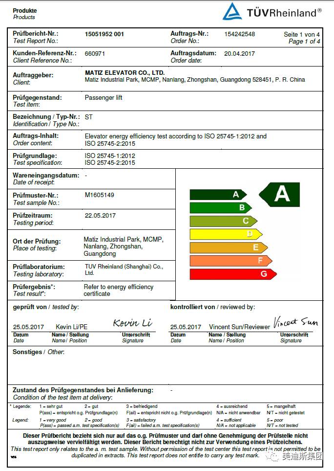 MATIZ Traction machine passenger elevator (M1605149) successfully passed and won the highest energy efficiency certificate at A level for its comprehensive energy efficiency based on the VDI 4707 Standard in the last few days.