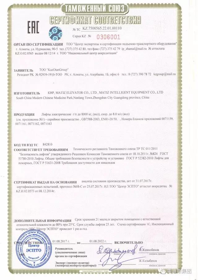 2017年8月1日,美迪斯電梯最大速度8米/秒,最大載重8000kg通過海關聯盟CU-TR認證。(統一標志為EAC)