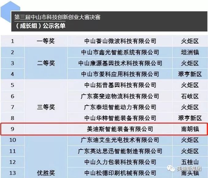 2018年12月13日,為期6個多月的第七屆中國創新創業大賽(廣東·中山賽區)暨第三屆中山市科技創新創業大賽落下帷幕,217家企業踴躍參加大賽,經過初賽、復賽、調查、省決賽、行業總決賽等環節,最終66家企業晉級市決賽,經過激烈的角逐,美迪斯取得本次比賽成長組的三等獎。
